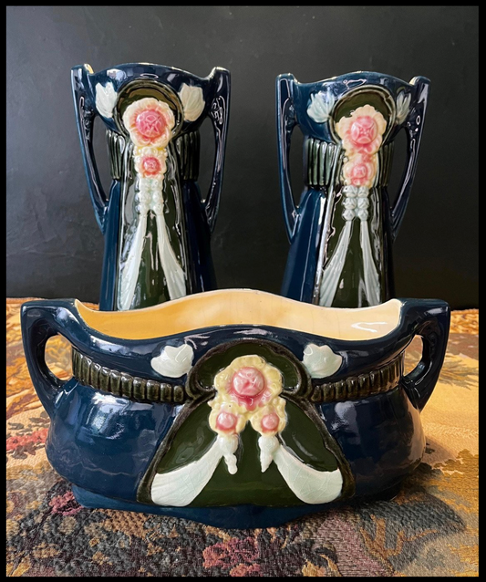 Waechtersbach Majolica Set - Art Nouveau Jardinière met Vazen - Wilde Rozen Decor