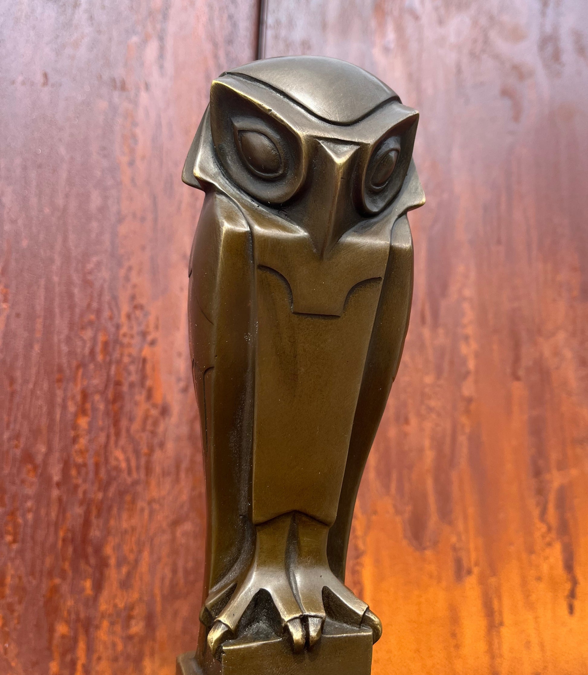 Een prachtig en strak vormgegeven bronzen sculptuur met voorstelling van een uil, uitgevoerd in art deco stijl.