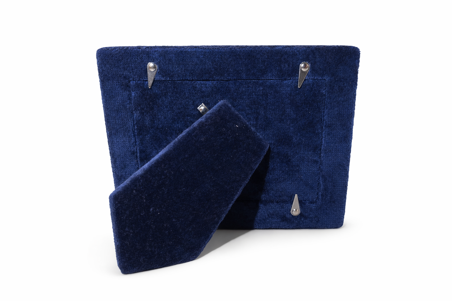 De zilveren voorzijde is met zorg over een stevige kern geplaatst, zoals gebruikelijk bij authentieke fotolijsten uit deze periode. De achterkant is afgewerkt met een donker stoffen paneel en een stabiele standaard, waardoor de lijst perfect tot zijn recht komt op een dressoir, sidetable of nachtkastje.