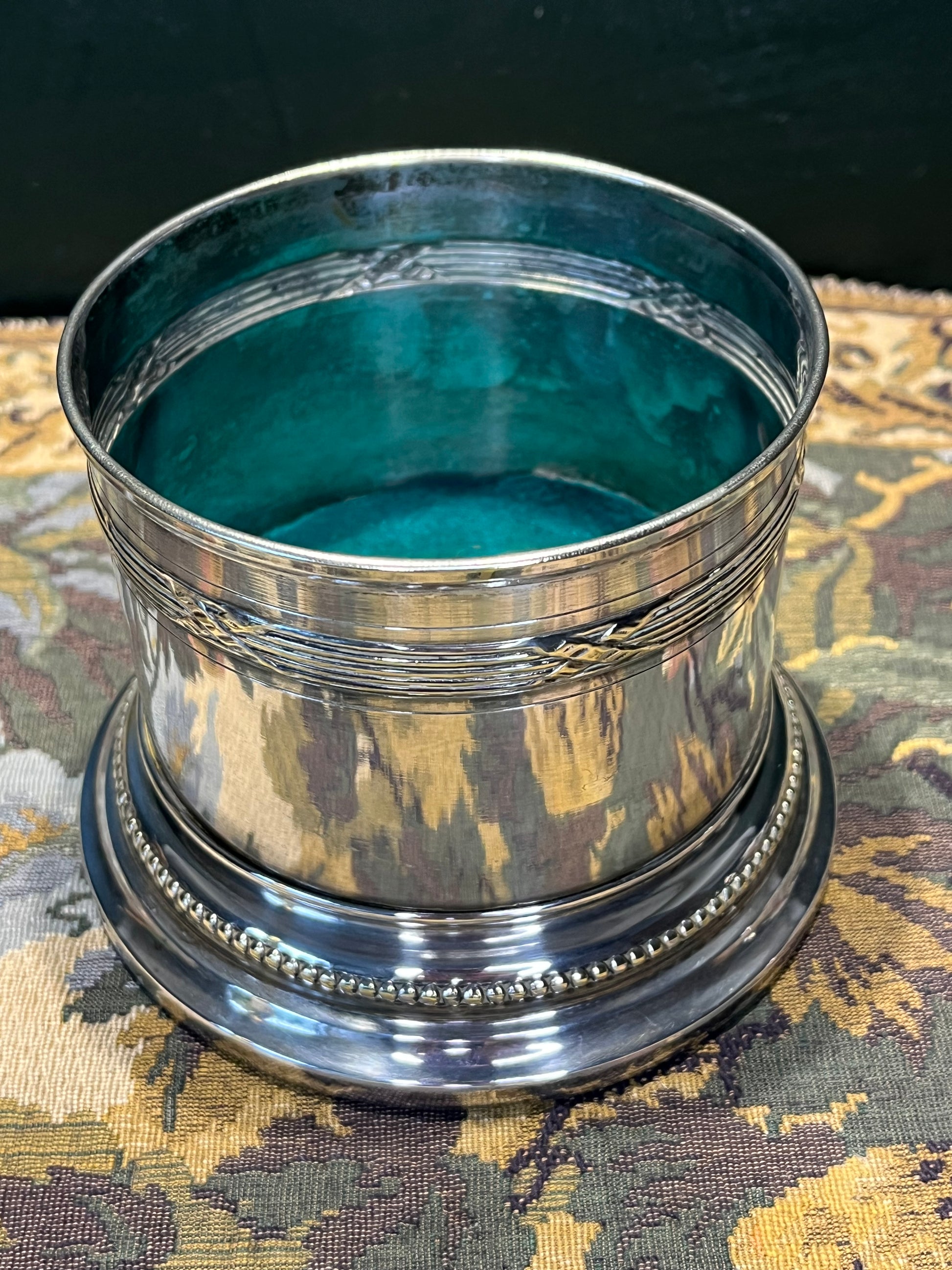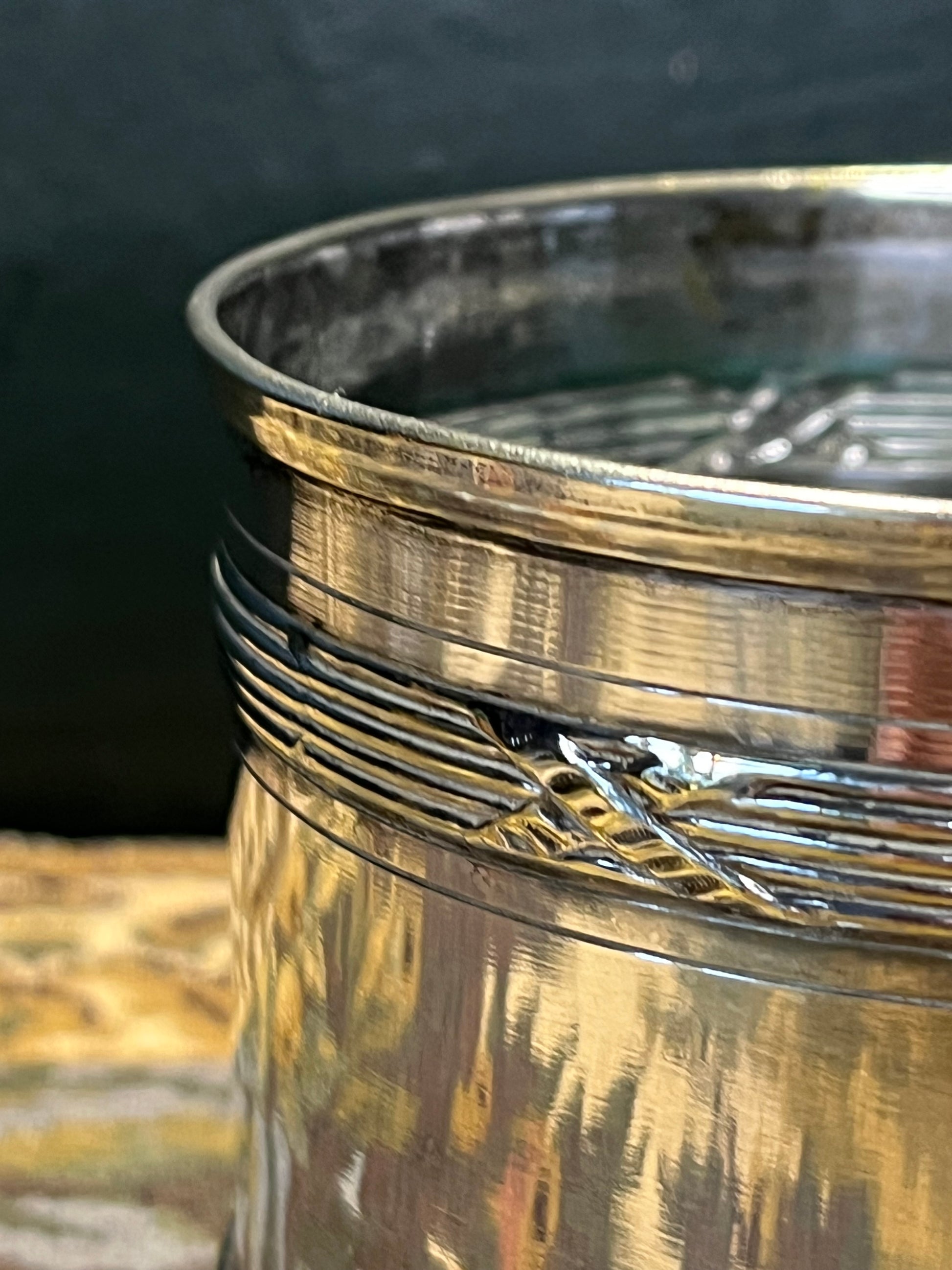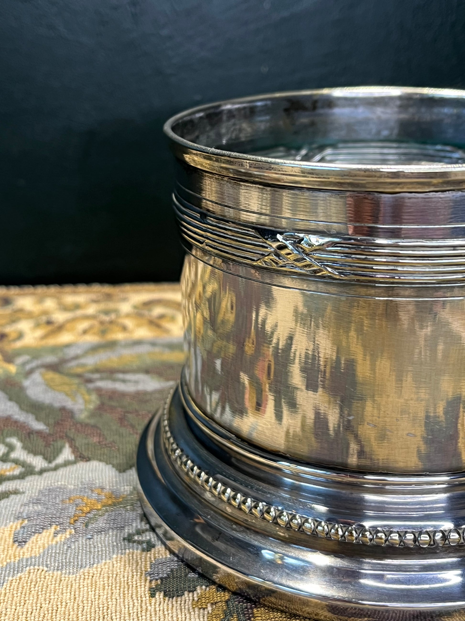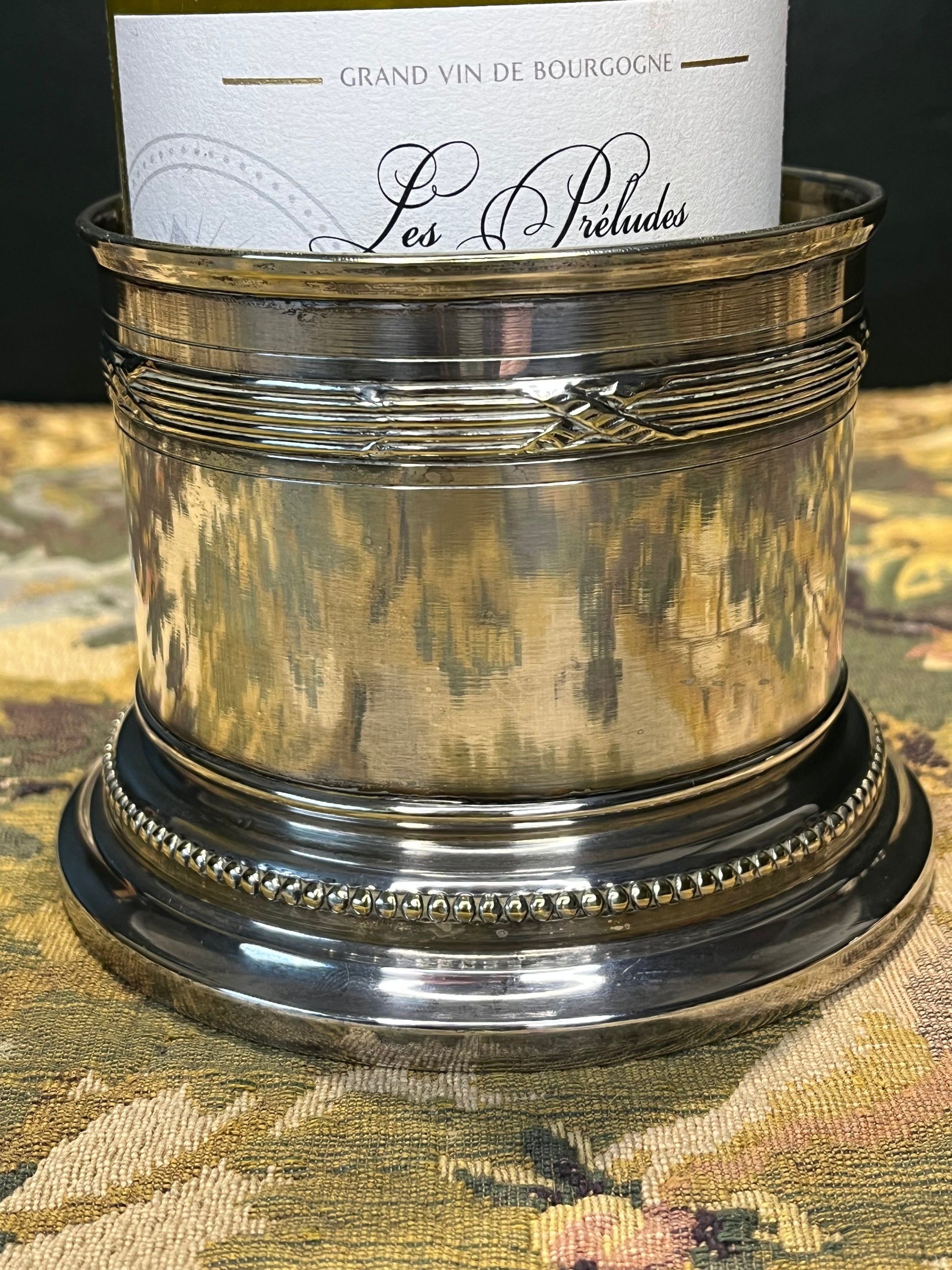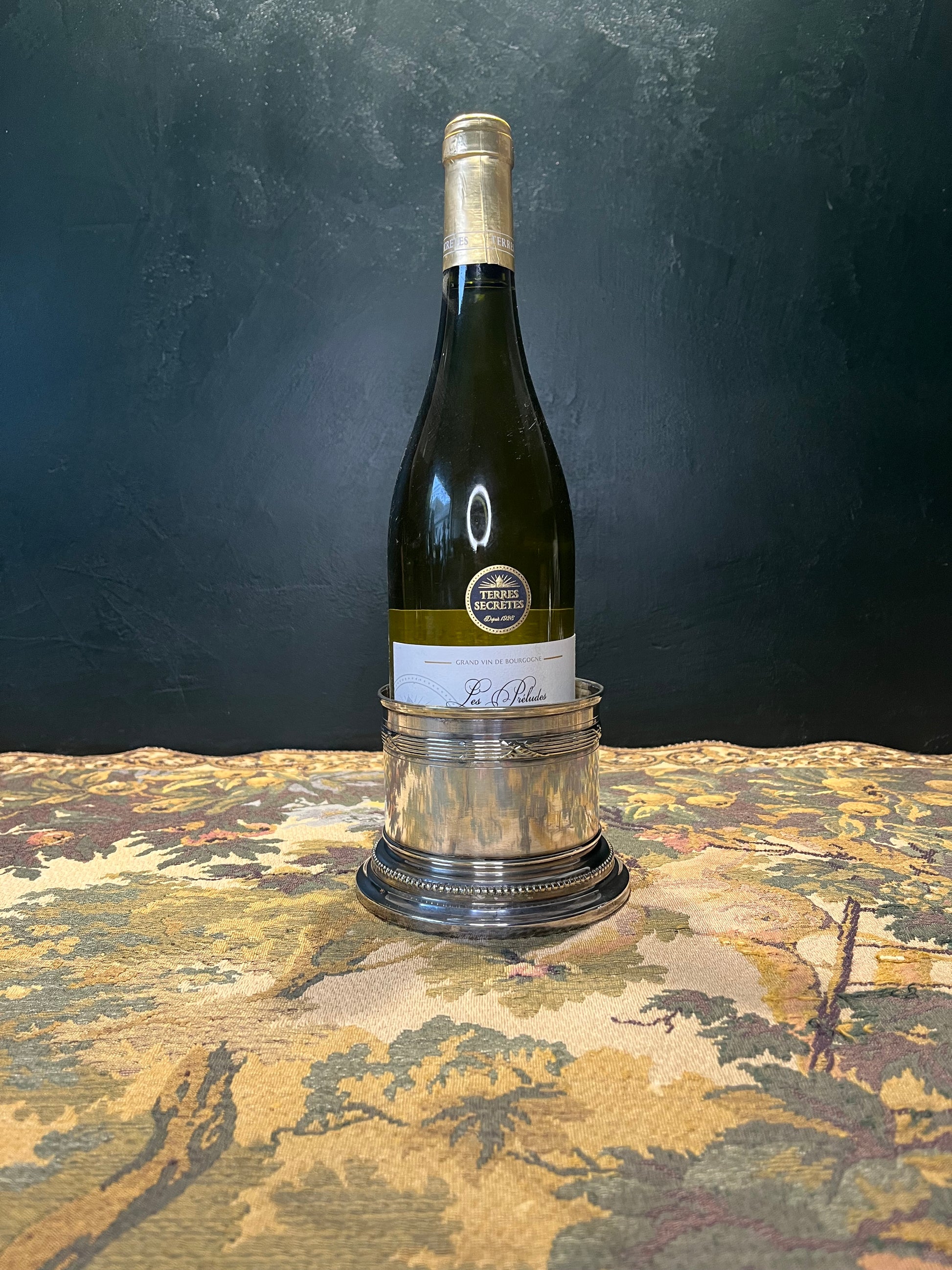 Deze wijnhouder is meer dan een decoratief object - het is een praktisch stuk tafelzilver dat de fles elegant presenteert, beschermt tegen condensatie en druppels voorkomt op het tafeloppervlak. Perfect voor formele diners of als statement-piece op de eettafel.