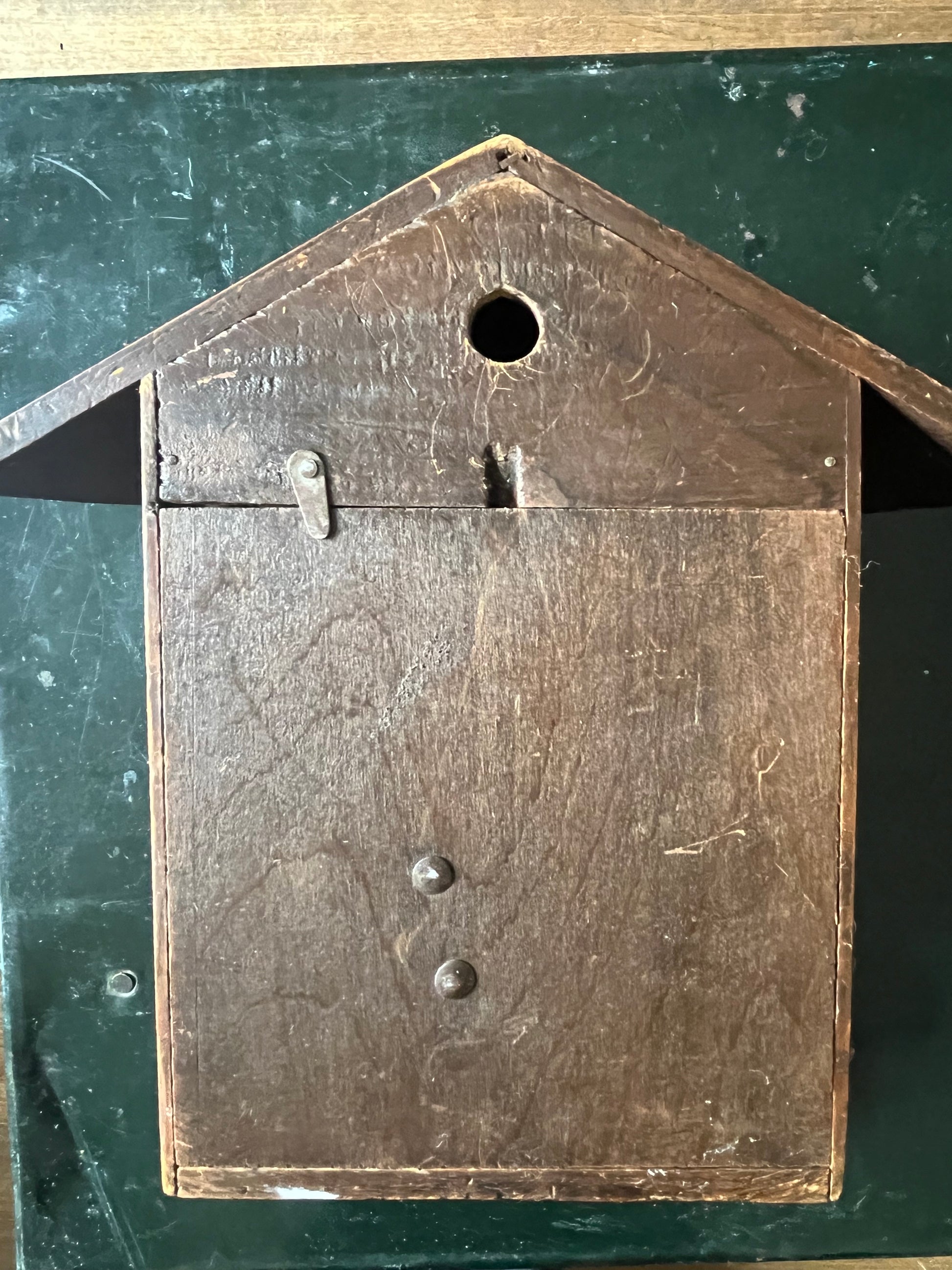 Dit koekoeksklokje gefabriceerd in Schwarzwald (Duitsland) rond de jaren 40 is werkend en heeft geen beschadigingen ondanks zijn leeftijd.