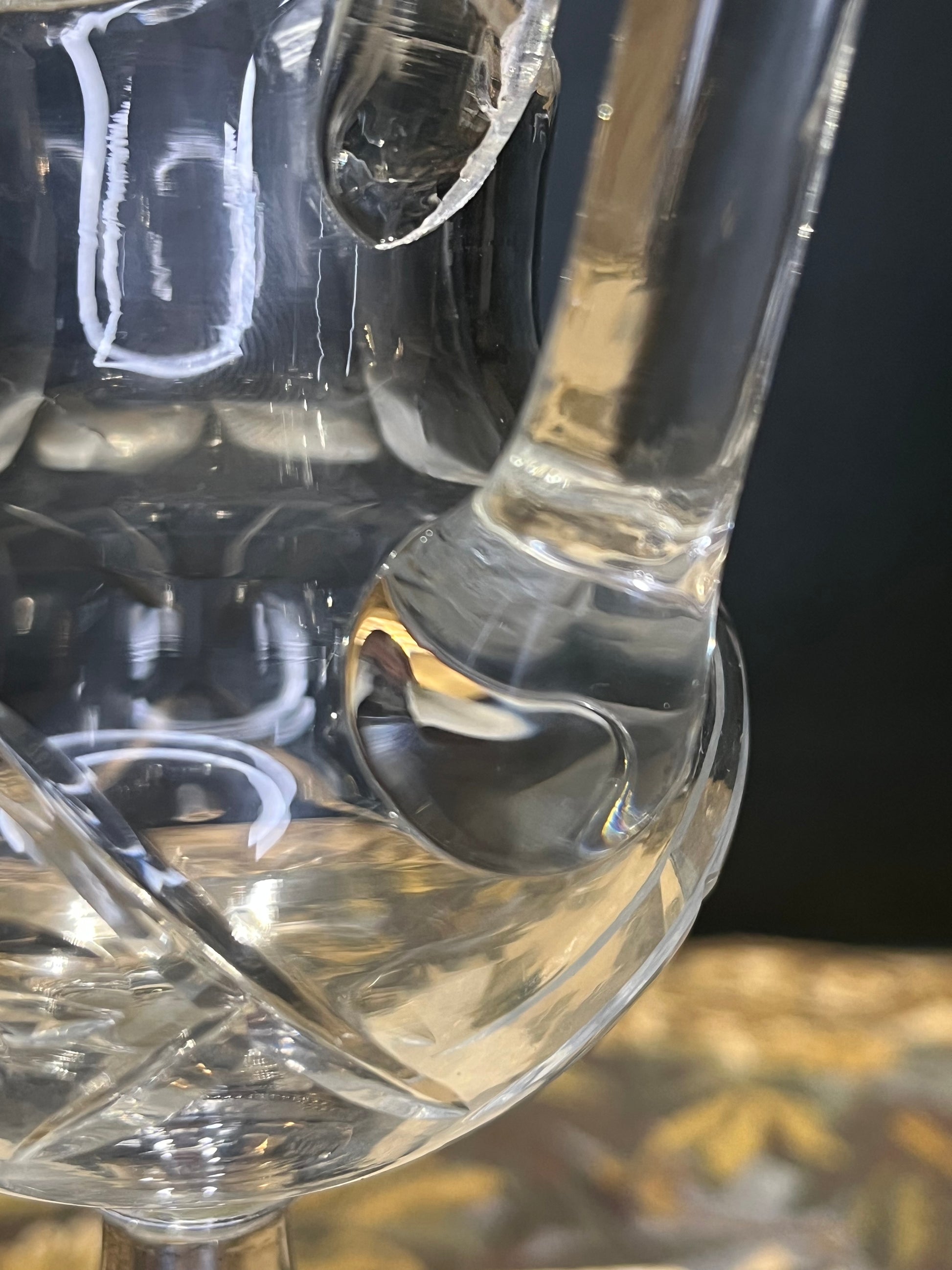 Dit uitzonderlijke meesterstuk combineert de fijnste kristalglaskunst met vakmanschap in edelmetaal. Het handgemaakte kristalglas is vervaardigd met selenium voor een heldere, ontkleuring en vertoont een subtiele lichtgroene gloed onder UV-licht - een kenmerk van authentiek antiek kristal.