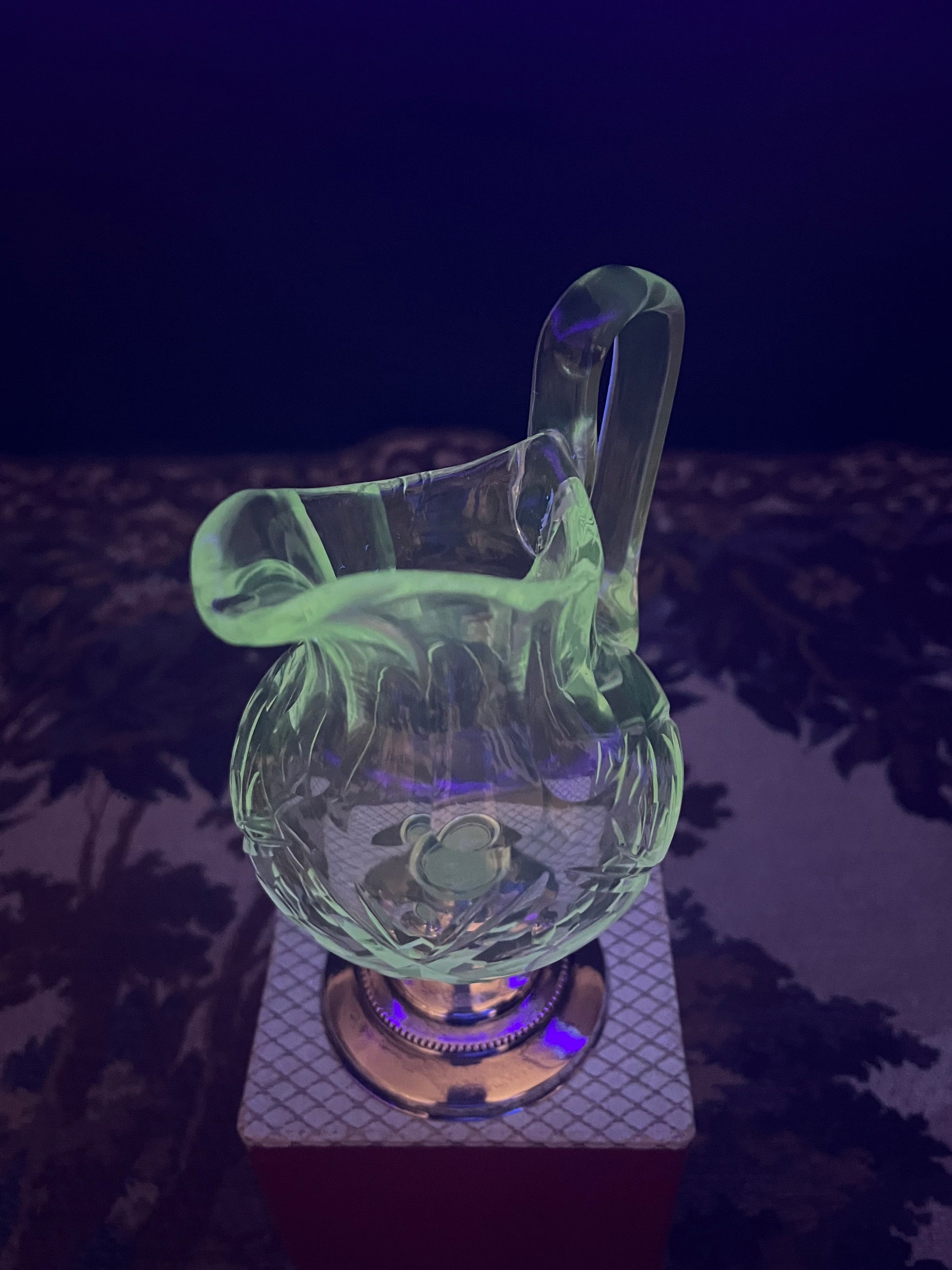 Zeldzaam antiek olijfslijpsel kristallen roomkannetje op sterling zilveren parelvoet