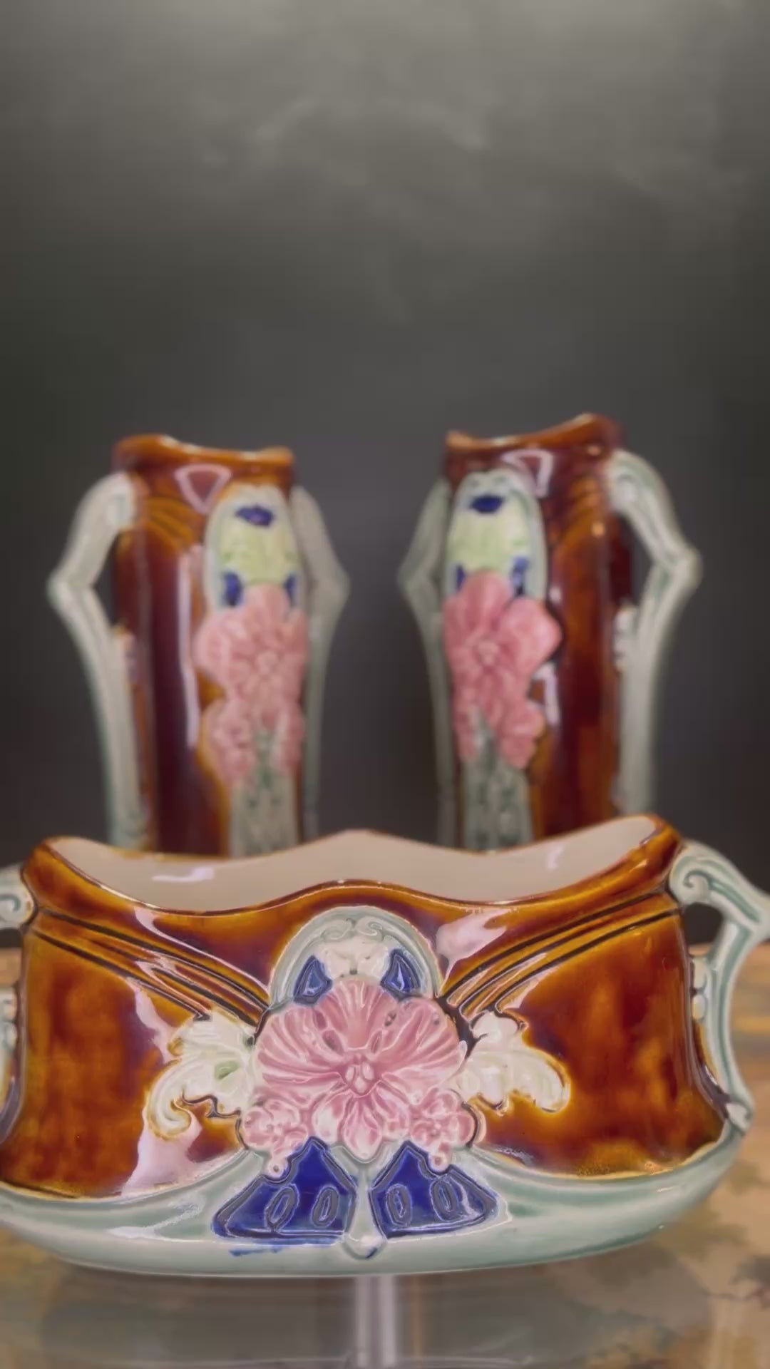 Een prachtig en smetteloos antiek kaststel uit de vroege 20e eeuw, geproduceerd door de gerenommeerde Waechtersbacher Keramikfabrik in Duitsland. Dit elegante 3-delige ensemble bestaat uit een cache pot (jardinière) en twee bijpassende vazen, perfect voor een stijlvol interieur.