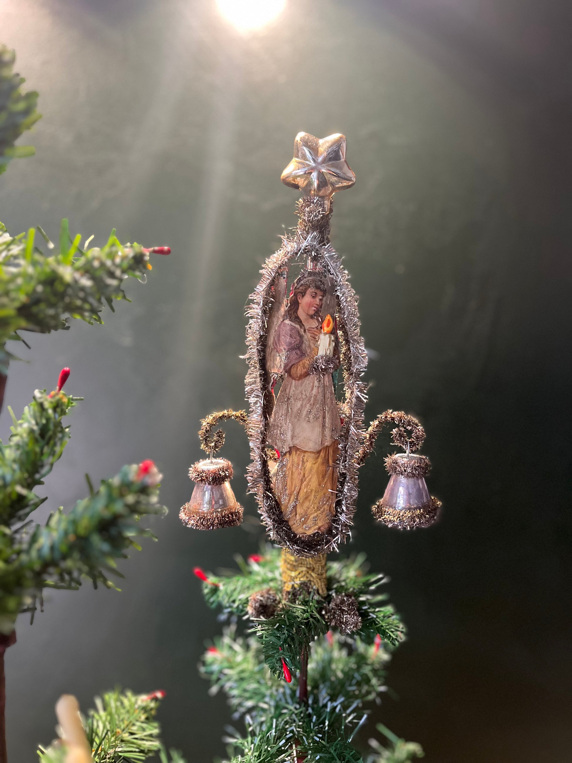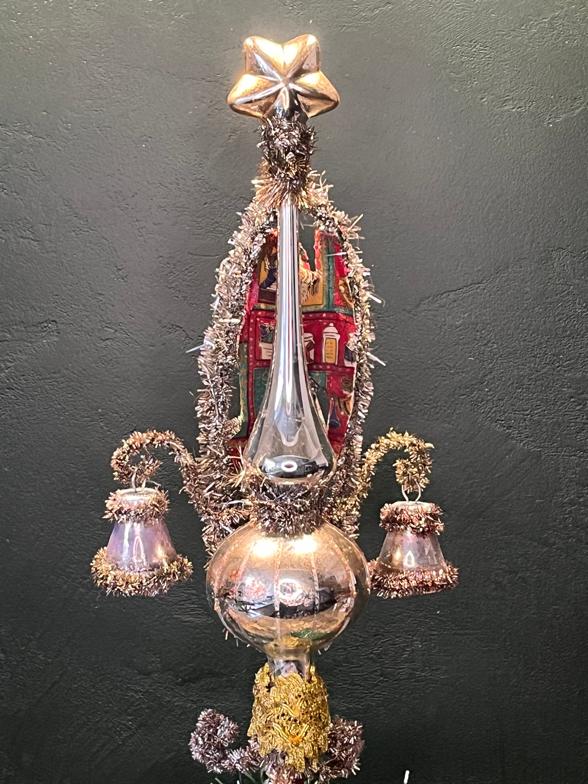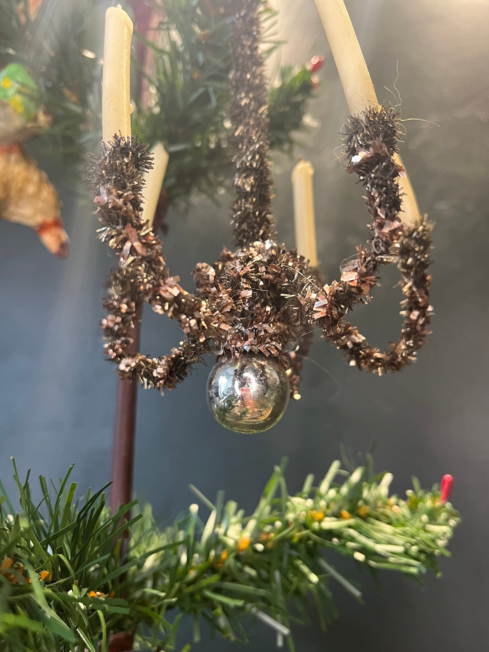 Bestaande uit een kerstpiek en een kroonluchter kandelaar met echte kaarsjes.