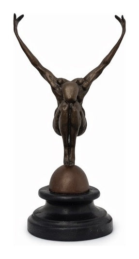 Deze bronzen sculptuur van Milo (1910–1978) verbeeldt een acrobaat in een moment van uiterste concentratie en lichamelijke beheersing. De figuur balanceert op een bol, met wijd gespreide armen die de spanning tussen beweging en stilstand benadrukken. Het werk vormt een krachtige studie naar evenwicht, kracht en menselijke controle.