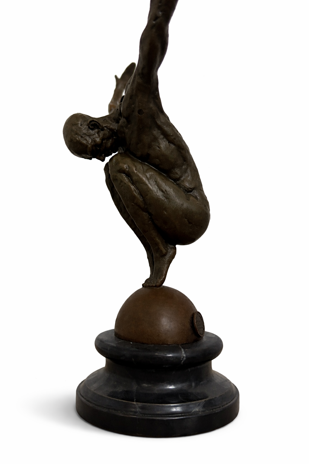 De compositie is karakteristiek voor de Art Deco-periode, waarin dynamiek, geometrie en gestileerde vormen centraal staan. Het lichaam is strak en expressief gemodelleerd, met langgerekte lijnen die de beweging versterken zonder overbodige detaillering. De donkere, warme patina accentueert de plastiek en geeft het beeld een ingetogen, monumentale uitstraling.