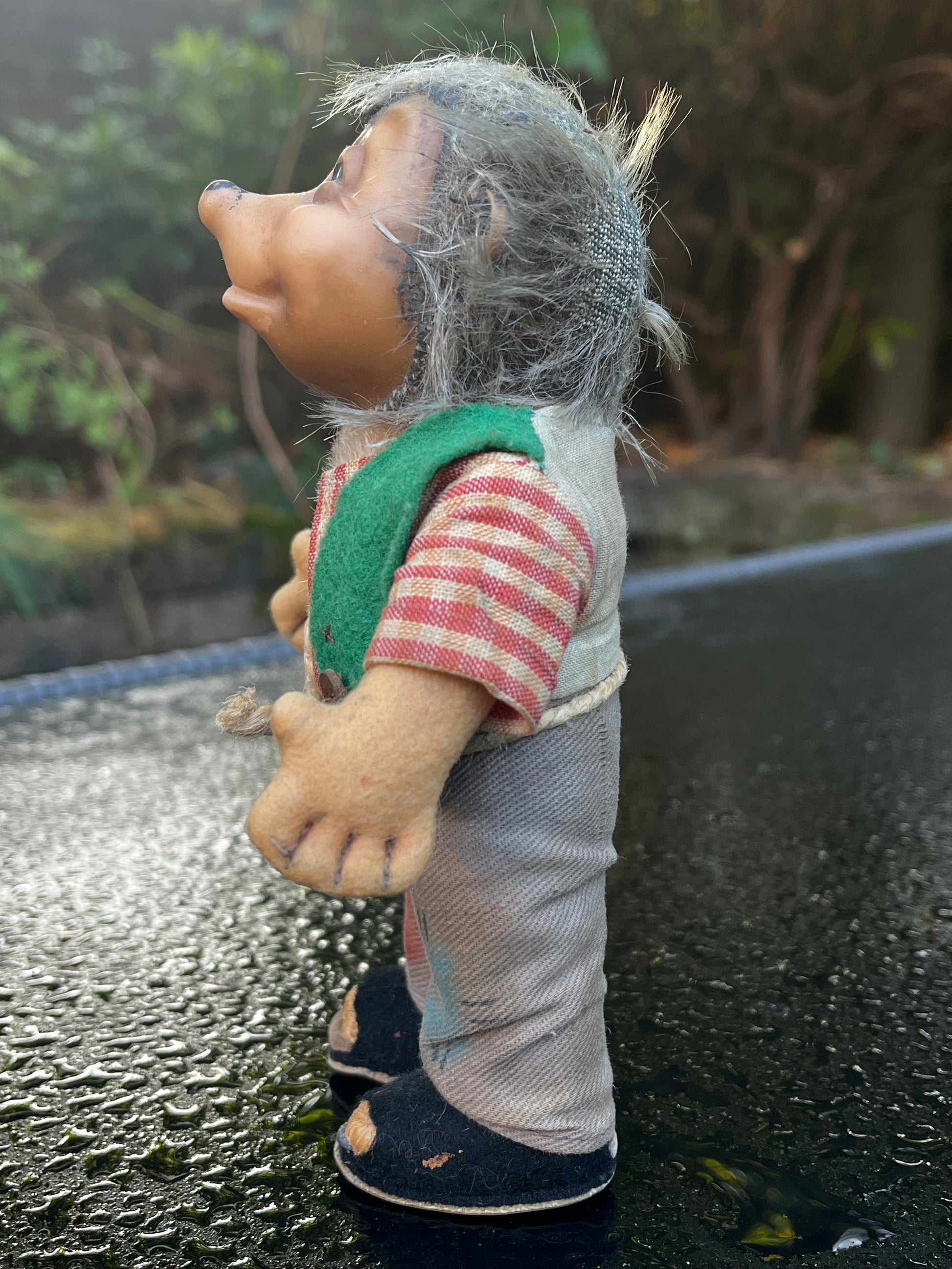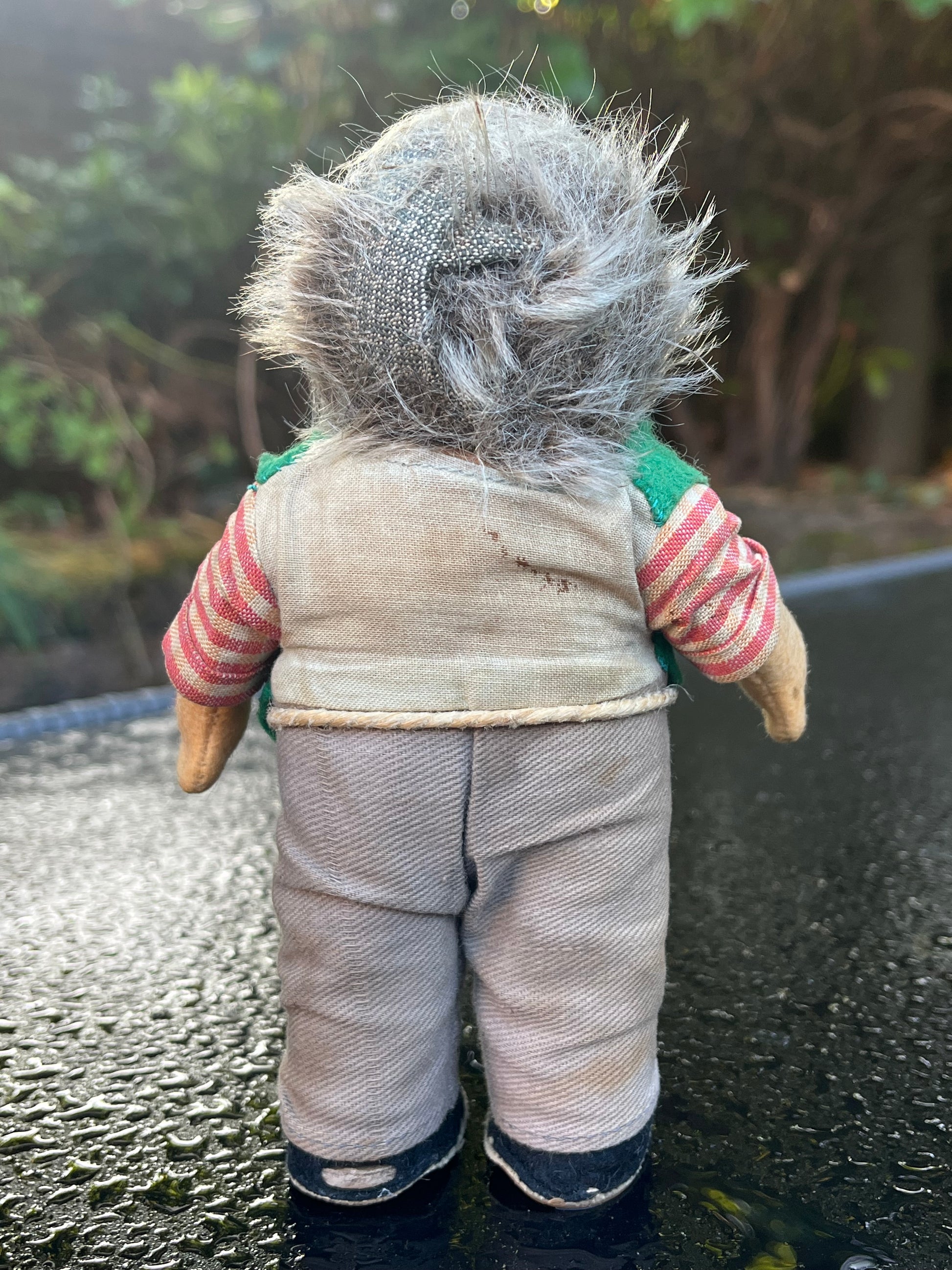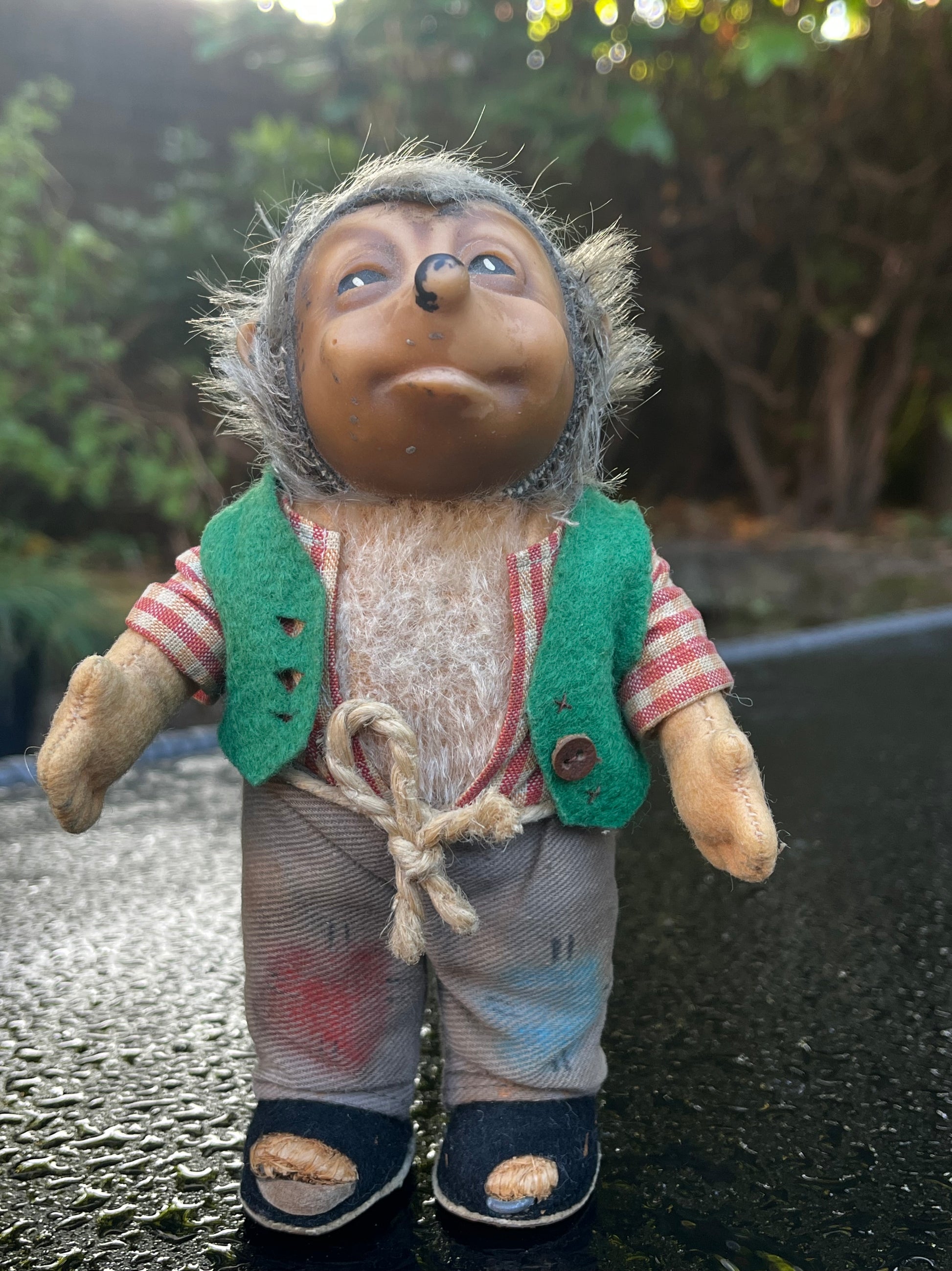 Het egeltje heeft een rubberen gezicht met mohair haren draagt een geruit hemd maar anders dan alle andere Mecky's heeft deze een groen chaletje. Jammer genoeg heeft de egel geen kaartje of 'Knopf im Ohr' meer.