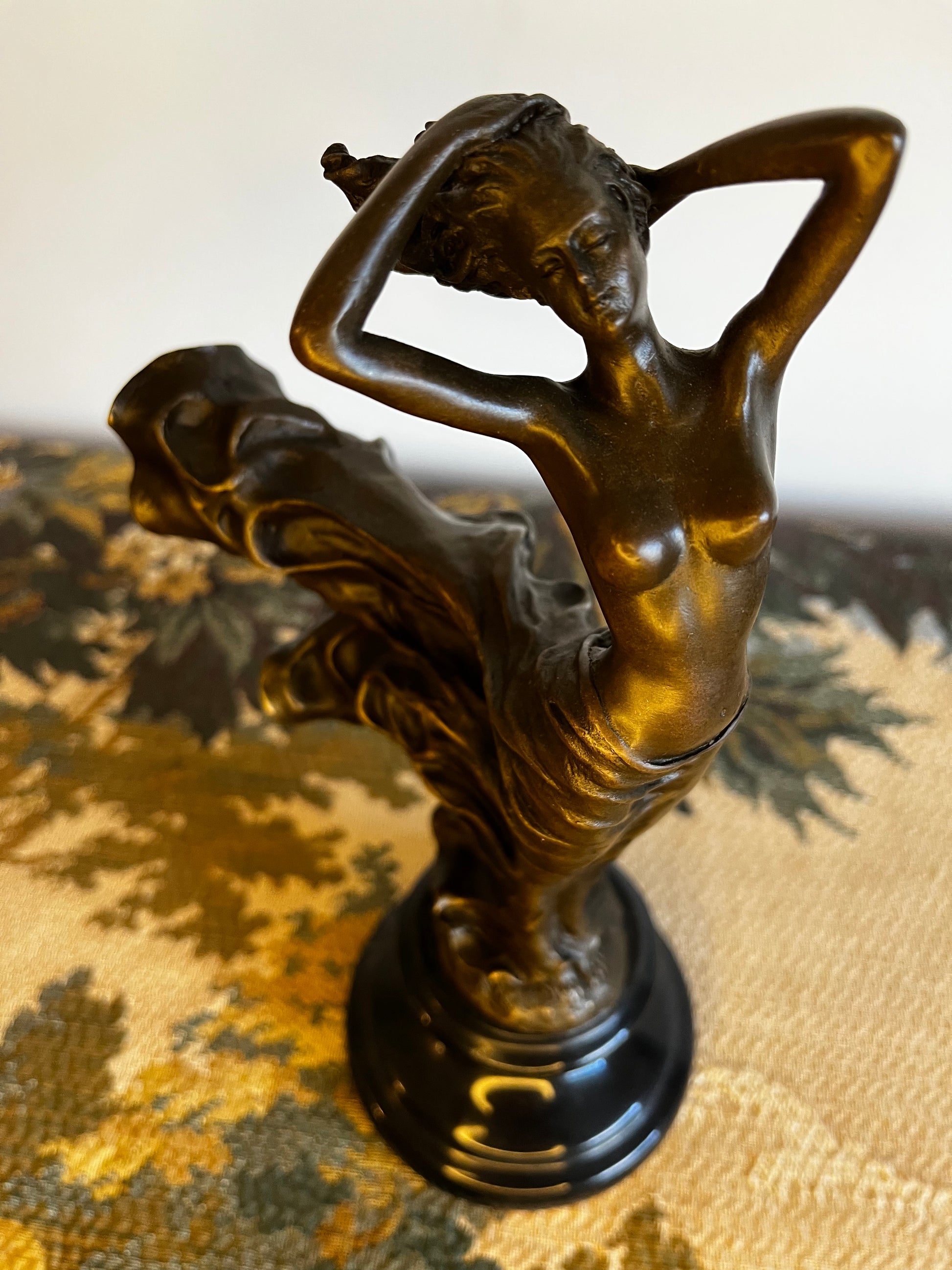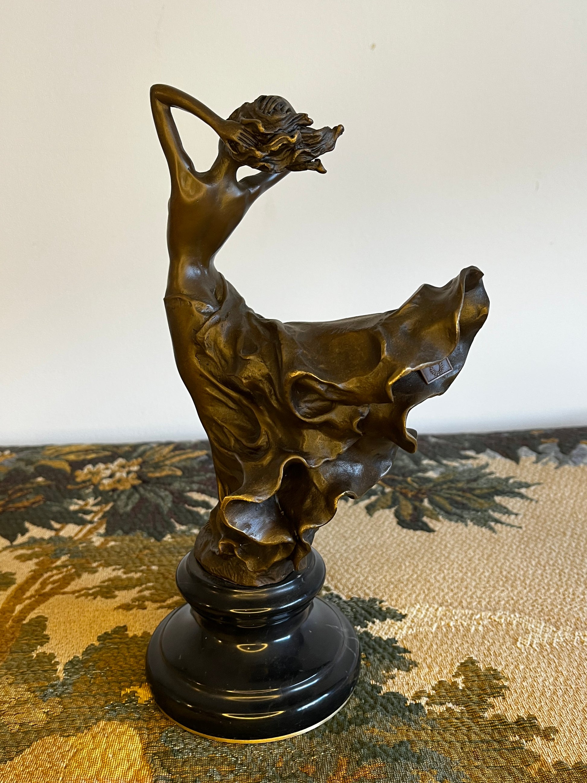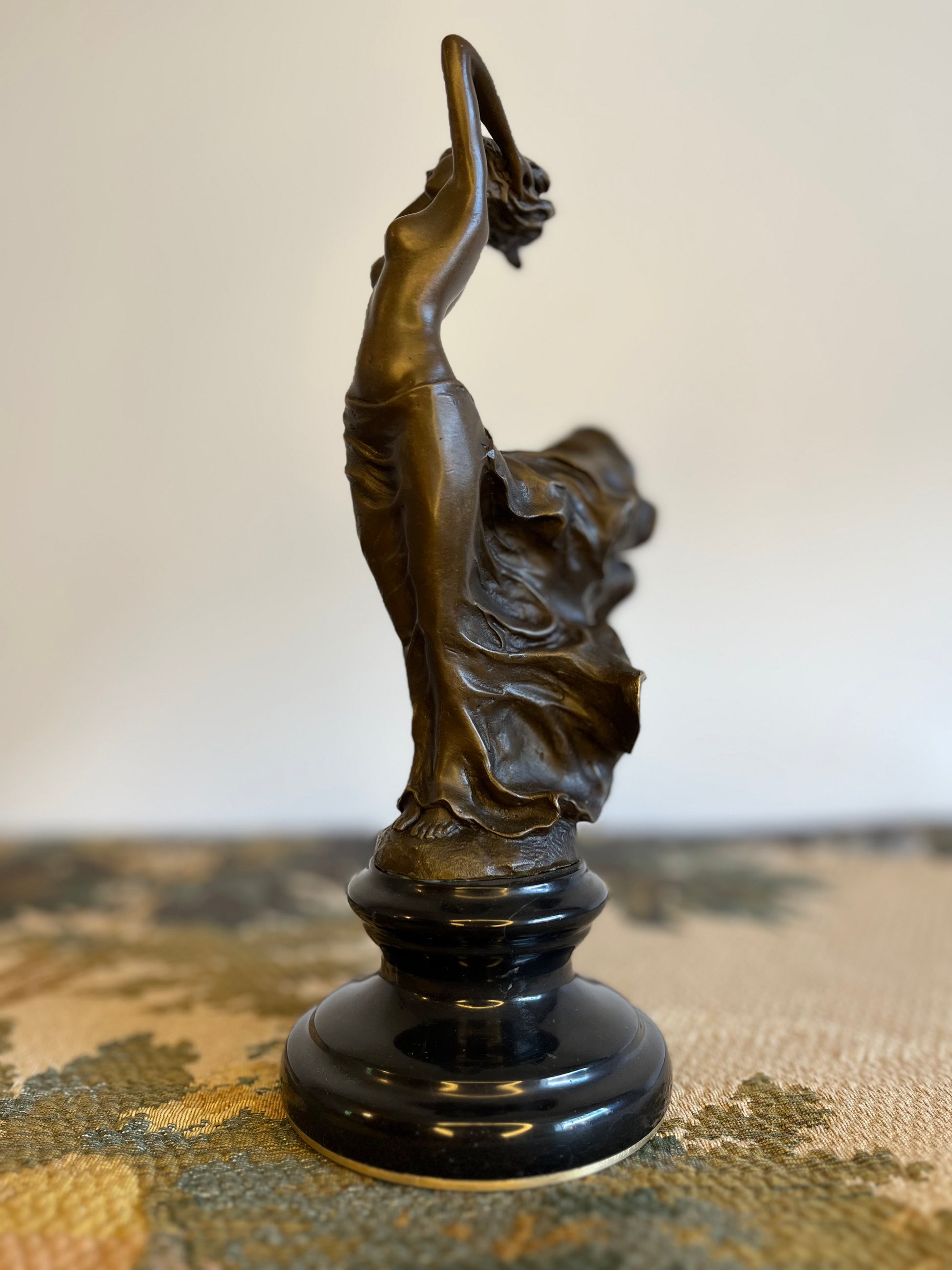 Een betoverende bronzen statuette die de essentie van de Jugendstil en Art Nouveau belichaamt. Deze elegante vrouw, genietend van de wind en vrijheid, staat op een massief granieten plateau en straalt de poëtische schoonheid uit die kenmerkend is voor deze kunststroming.